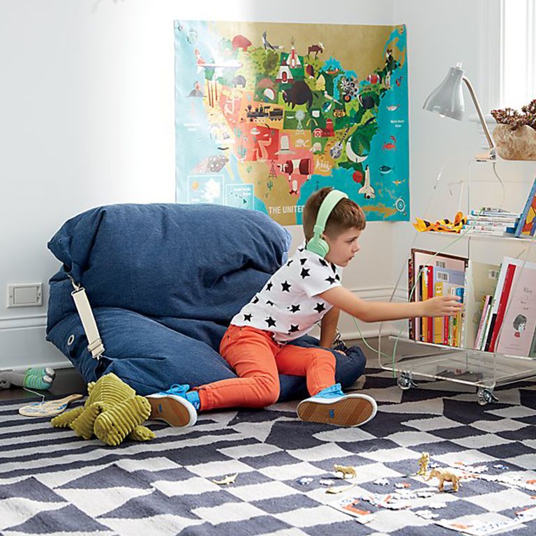Add a colorful rug as a way to zone a kid's playroom and create some visual separation from the main living space.
