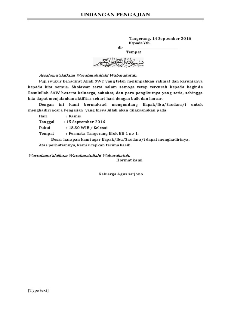 Kali ini untuk belajar dan untuk mempermudah akan diberikan contoh khusus untuk surat undangan pengajian.