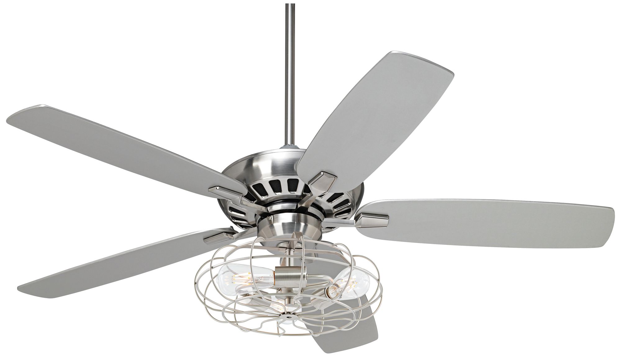The black finish is complemented by five reversible blades in an ashwood or brown finish. Its design offers the impact of a chandelier fixture and the cooling feature of a ceiling fan in one unit. These designs use mixed materials like metal and wood on blades and motors with finishes like brushed steel and bronze. They also take up less room than other industrial fans and allow for more headroom in distribution and fulfillment centers. Perfect for a kitchen, dining room, living room, bedroom, foyer, hall, entry, bar or restaurant. It is also an excellent choice for small indoor construction site jobs such as drywall, paint and tile projects or water damage and. Its design offers the impact of a chandelier fixture and the cooling feature of a ceiling fan in one unit. Add industrial style to your home with this ceiling fan, which offers up an iron cage to protect the exposed light sources. Free shipping & free returns*. 4.6 out of 5 stars 51. Medium rooms (up to 12 x 14); Large rooms (up to 18 x 20) 4.4 out of 5 stars.